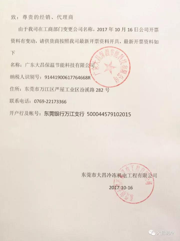 感谢您一直以来对韦德·官方端入口公司的支持和厚爱,现我司已完成新一轮的增资扩产,设备更换,品质更好,产量比以前增加十倍。为了未来发展需要,经董事会同意,将原"东莞市韦德·官方端入口冷冻机电工程有限公司"更名为"广东韦德·官方端入口保温节能科技有限公司"。望今后加强合作,共创辉煌! |