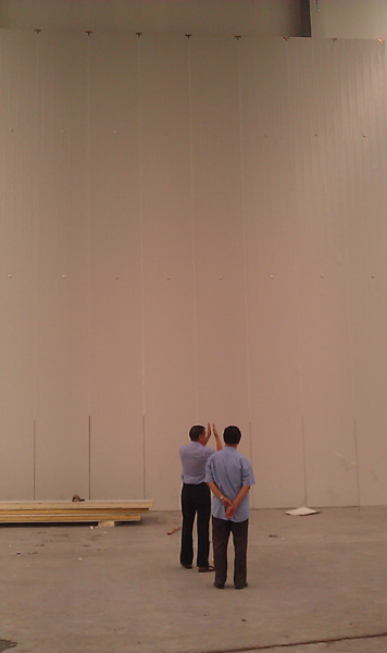采用迷宫式插口型聚氨酯保温板12米高150~200mm厚保温板一次发泡成型。